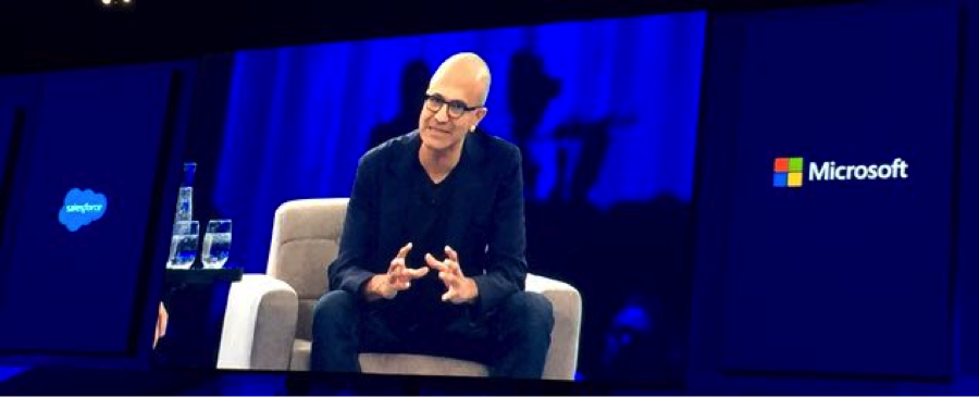En una de las sesiones más importantes de Dreamforce el CEO de Microsoft Satya Nadella mantuvo una intensa charla con Jessi Hempel de la revista Wired, donde presentó diversos aspectos del trabajo conjunto con Salesforce, y delineó claramente su visión donde el poder computacional estará en cada aspecto de la vida de los consumidores, dando claras muestras de una estrategia de Microsoft centrada en dispositivos conectados a la nube.